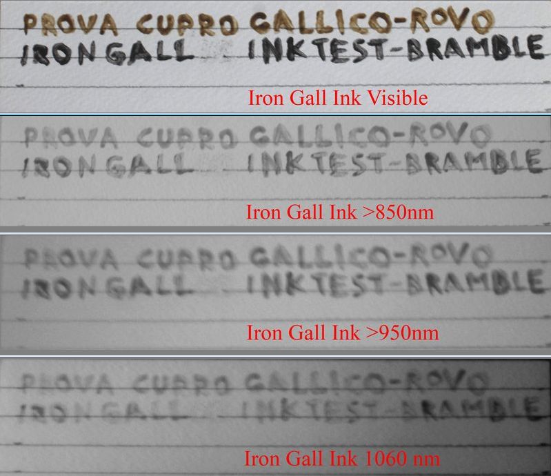 Here we show how the gal inks (Iron and Cupro) became more and more transparent by changing IR filters in a Multispectral camera.